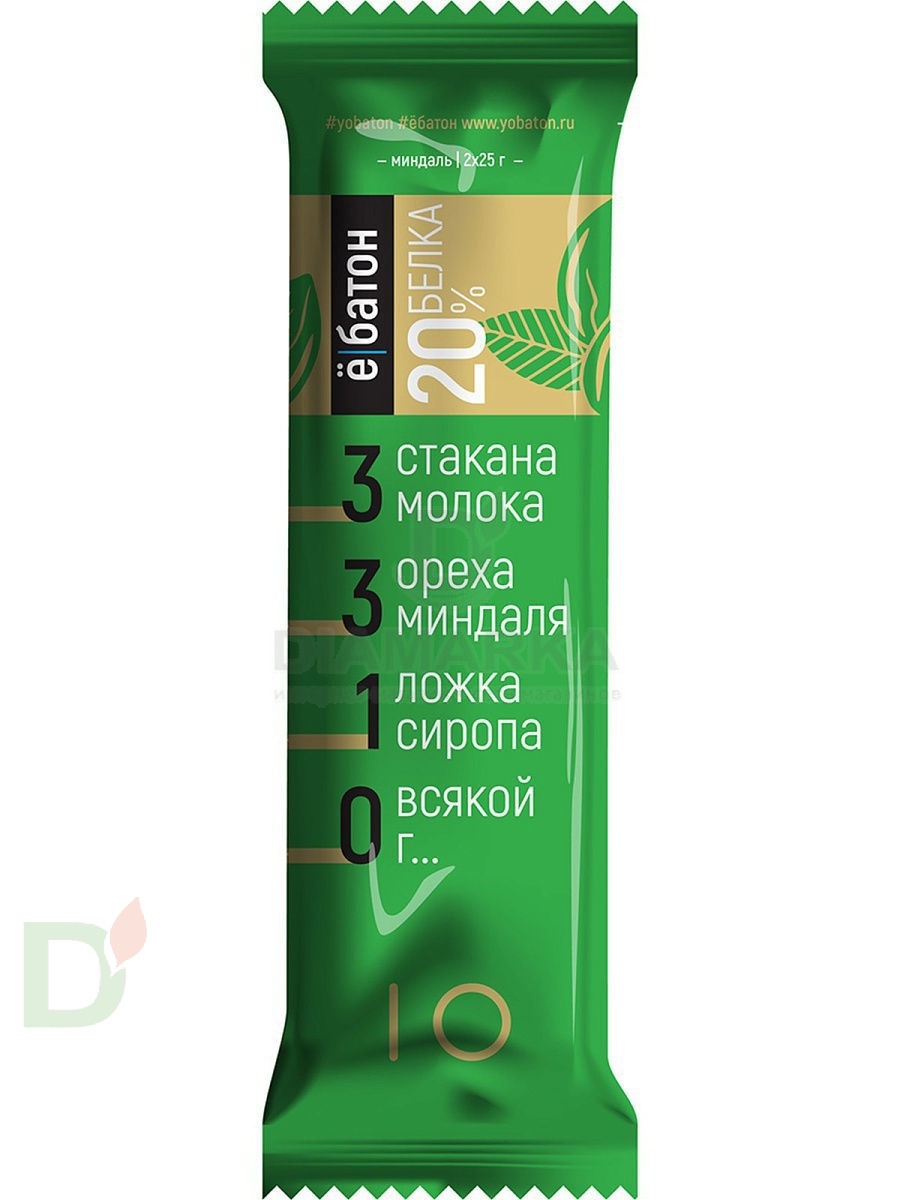 <h2>Протеиновый батончик в шоколадной глазури без сахара</h2> Питательность, натуральный вкус, приятная текстура и хороший состав - вот что такое протеиновые батончики Ё/батон! Перед или после занятий спортом, на работе/ учебе/ в дороге, с чаем или просто так - хорошему протеиновому батону всегда и везде найдется применение ;)<br> <h2>10 грамм белка (20%) в одном батончике</h2> Это много, весьма много! Например, как в стакане молока, или крупном курином яйце.<br> Белок - незаменимый строительный материал для мышц. Как нутриент, он дает нам длительное чувство насыщения. Если нет времени на полноценный перекус, а чувство голода все нарастает и нарастает - съешьте один батончик Ё/батон! Бодрости и сытости вам хватит еще на пару часов плодотворной работы.<br> <h2>Батончик обогащен витаминами и минералами</h2> Да-да: он не только насытит и порадует вас своим вкусом, но и пополнит витаминно-минеральный баланс организма!<br> <b>Это идеальный продукт для спортсменов, людей с диабетом, сторонников ЗОЖ и ПП!</b><br> <br> Вес: 50 грамм<br> Срок годности: 9 месяцев<br> <h2>Состав батончика со вкусом Миндаля</h2> концентрат молочного белка, концентрат сывороточного белка, сироп цикория, карамель, шоколадные дропсы, витамины (С, В1, В3, В5, В6, В12), фолиевая кислота, эмульгатор лецитин, соль морская, регулятор кислотности лимонная кислота, глазурь (заменитель какао-масла, эмульгатор лецитин, какао порошок, молоко сухое цельное)<br> <h2>Пищевая и энергетическая ценность на порцию/50гр</h2> белки 10г<br> насыщенные жиры 6г<br> транс жиры 0г<br> углеводы 22г<br> сахар 0г<br> 182 ккал<br> <br> пищевые волокна 2г<br> витамин С 17,7мг (29,5%*)<br> ниацин 4,8мг (26,7%*)<br> витамин В5 1,68мг (28%*)<br> витамин В6 0,72мг (36%*)<br> витамин В1 0,66мг (47%*)<br> фолиевая кислота 54мкг (27%*)<br> биотин 0,03мг (60%*)<br> витамин В12 0,6мг (60%*)<br> <br> * - Средняя Суточная Потребность (в одной порции).