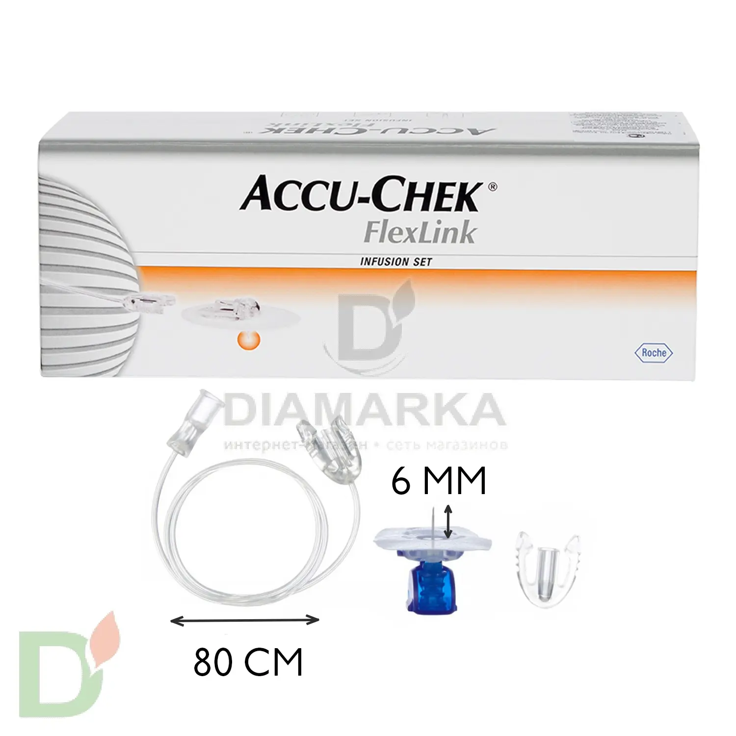 <h2>Самым маленьким и не только</h2> Инфузионный набор с подобной канюлей будет удобен для маленьких детишек и стройных людей. Длинна инфузионной трубки - 80 см - является универсальной.<br> <h2>Куда установить канюлю</h2> <ul> <li>на живот, наружную поверхность плеча, верхнюю наружная поверхность бедра, ягодицы.<br> </li> </ul> <br> Неприятные ощущения во время использования канюли исключены, так как материал канюли - мягкий, гибкий тефлон.<br> <br> Конкретный набор состоит из канюли длиной 6 мм и 80-ти сантиметровой инфузионной трубки.<br> <br> <b>Перед установкой канюли рекомендуем обезжирить кожу и обработать ее антисептиком.</b><br> <b> </b> <h2>Особенности инфузионных наборов Флекс Линк</h2> <ul> <li>Материал канюли - гибкий тефлон</li> <li>Установка под прямым углом 90% (перпендикулярно поверхности кожи)</li> <li>Отсоединение в месте крепления к коже</li> <li>Удобный съемный гриф для облегчения установки.</li> <li>Срок носки - 3 дня. После чего канюлю рекомендуется заменить на новую.</li> </ul> <h2>Что в коробке</h2> 1 упаковка содержит 10 индивидуальных упаковок;<br> 1 индивидуальная упаковка состоит из канюли длиной 6 мм, катетера 80 см и заглушки для приема водных процедур<br> <br> <b>Внимание! На фото представлена упаковка из 10 инфузионок Акку-Чек Флекс-Линк. Цена указана за 1 штуку.</b><br> <br> Срок годности: уточняйте у менеджера<br> Производитель: Roche Diagnostics - Германия