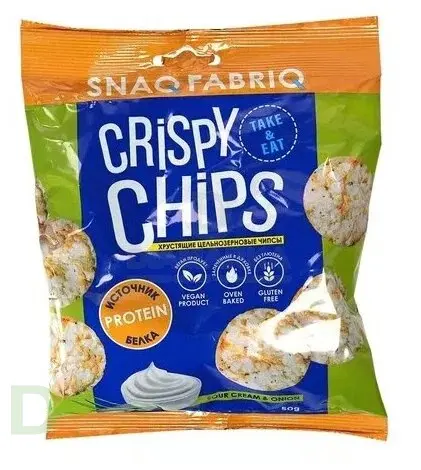 <h2>Хрустите чипсами без вреда для здоровья и фигуры</h2> Чипсы Snaq Fabriq - это хрустящий цельнозерновой снек для вкусного, сытного и полезного перекуса. Чипсы не обжариваются, а запекаются, что позволяет при производстве использовать меньше масла, следовательно, калорийность продукта значительно снижается!<br> <br> <h3>Чипсы не содержат сахара, глютена и лишних жиров</h3> На пачку чипсов приходится ВСЕГО 1 грамм жира (в обычных чипсах его примерно в 15 раз больше) и на 40% меньше калорий. Полезные чипсы бывают, и Снек Фабрик тому доказательство.<br> <br> Масса нетто: 50 грамм<br> <br> <h3>Состав чипсов Snaq Fabriq Сметана-Лук</h3> крупа рисовая, ароматизатор «Сметана с луком», вода, соль, масло подсолнечное рафинированное дезодорированное.<br> <h4>КБЖУ на пачку чипсов</h4> б - 3<br> ж - 1<br> у - 34<br> пищевые волокна - 2<br> 161 ккал